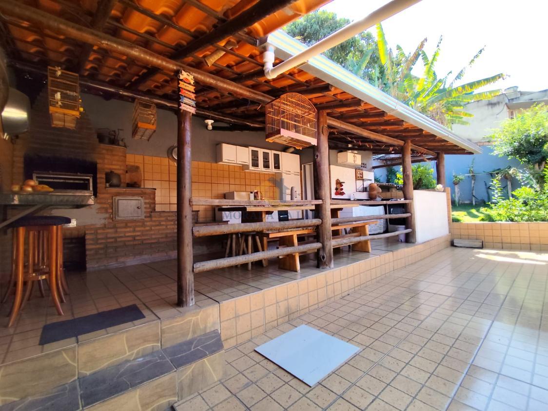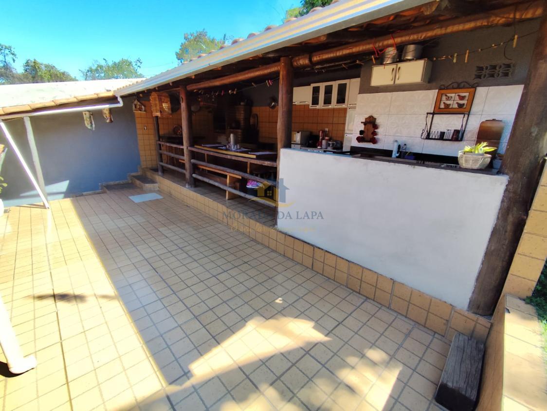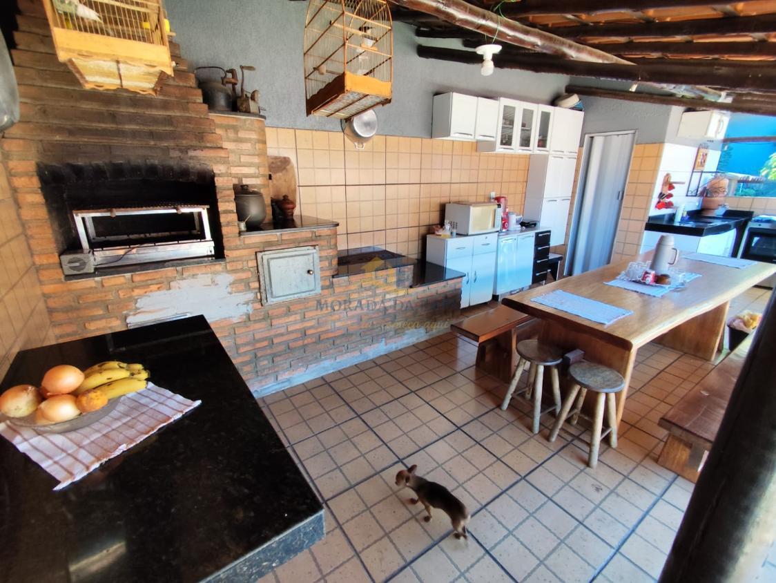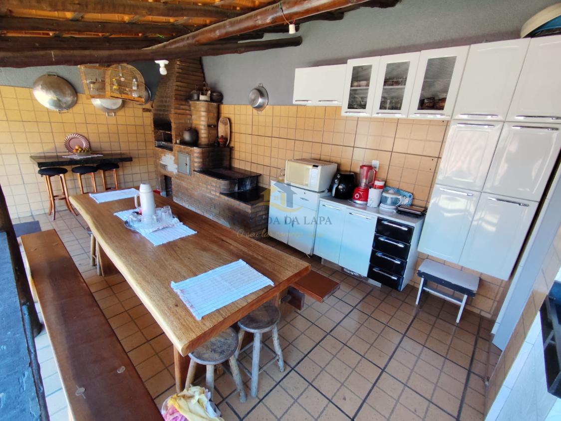 Área gourmet coberta com fogão a lenha, churrasqueira, pia com bancada em granito e lavabo