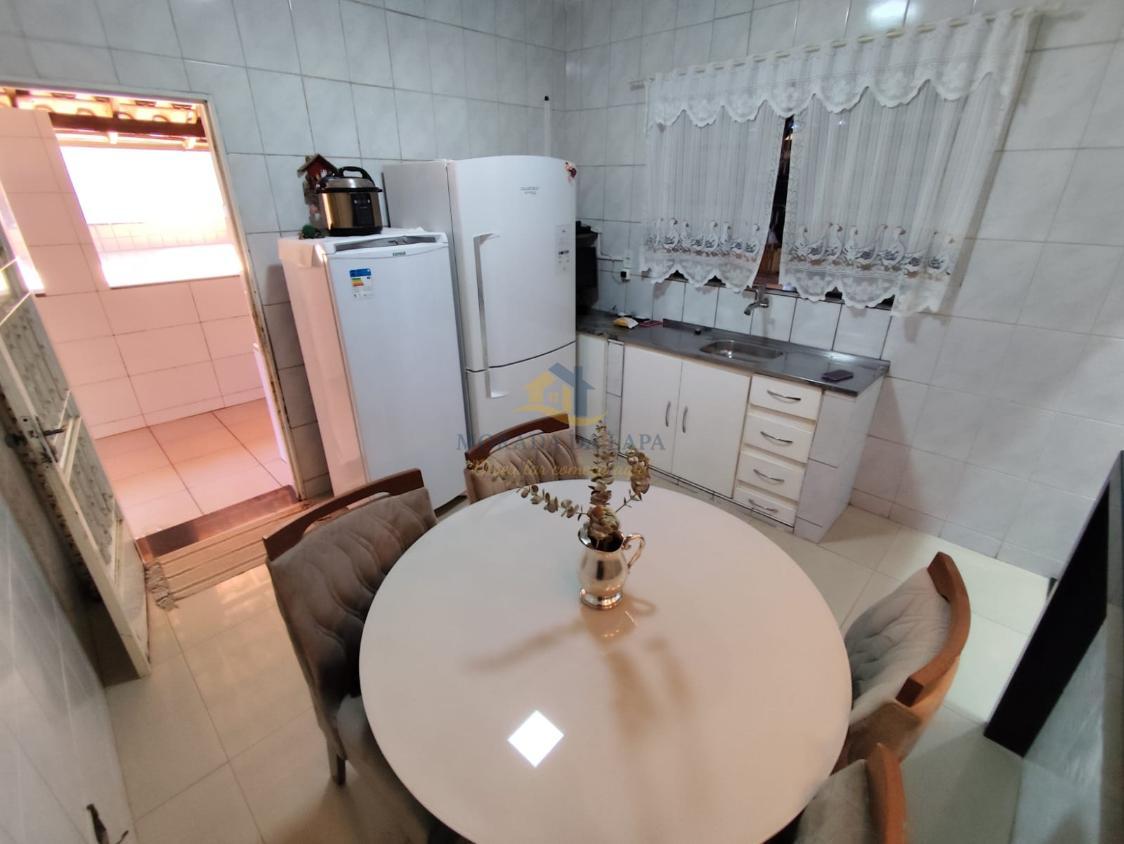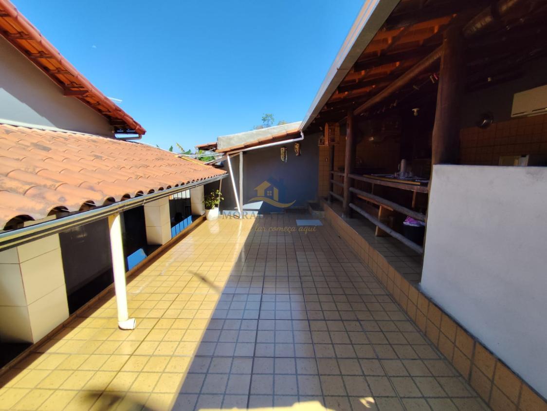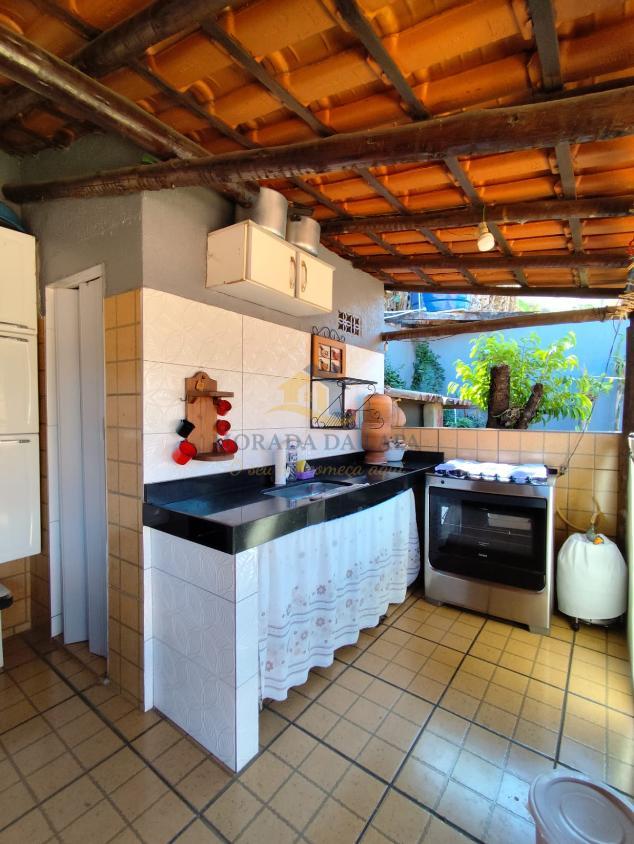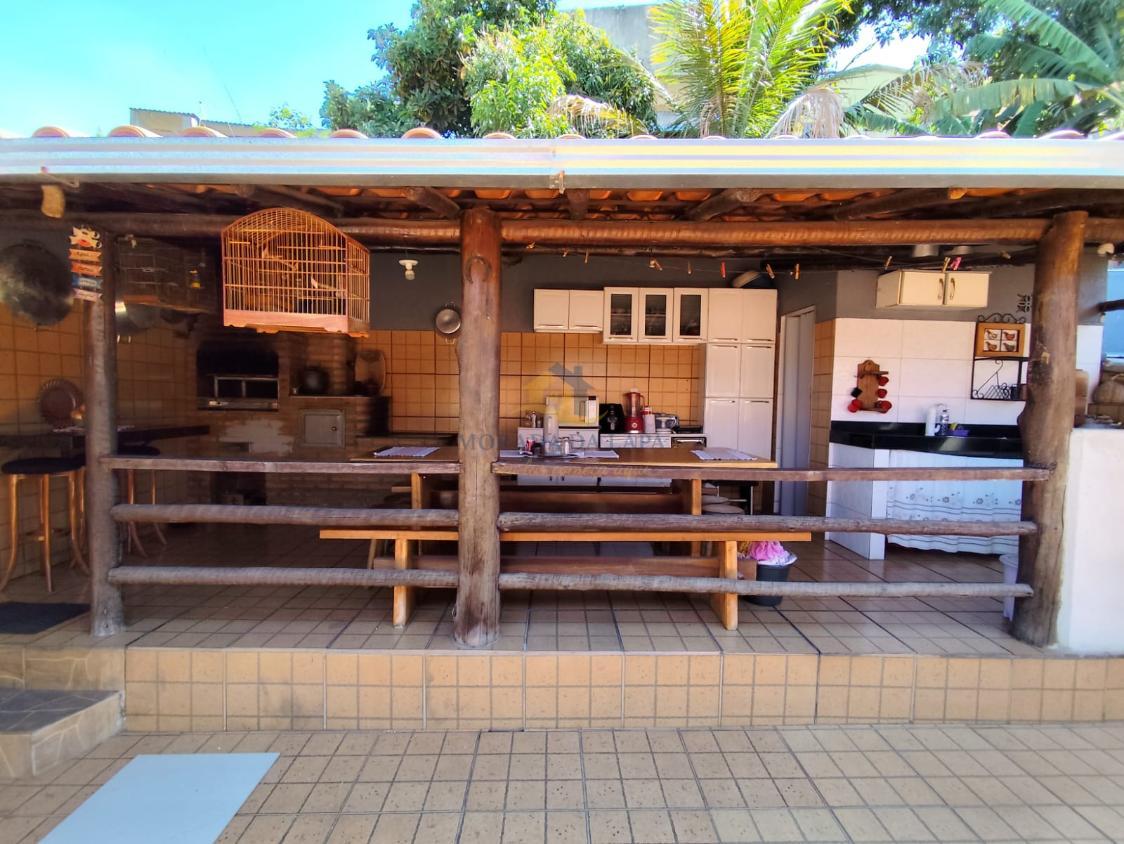 Área gourmet coberta com fogão a lenha, churrasqueira, pia com bancada em granito e lavabo