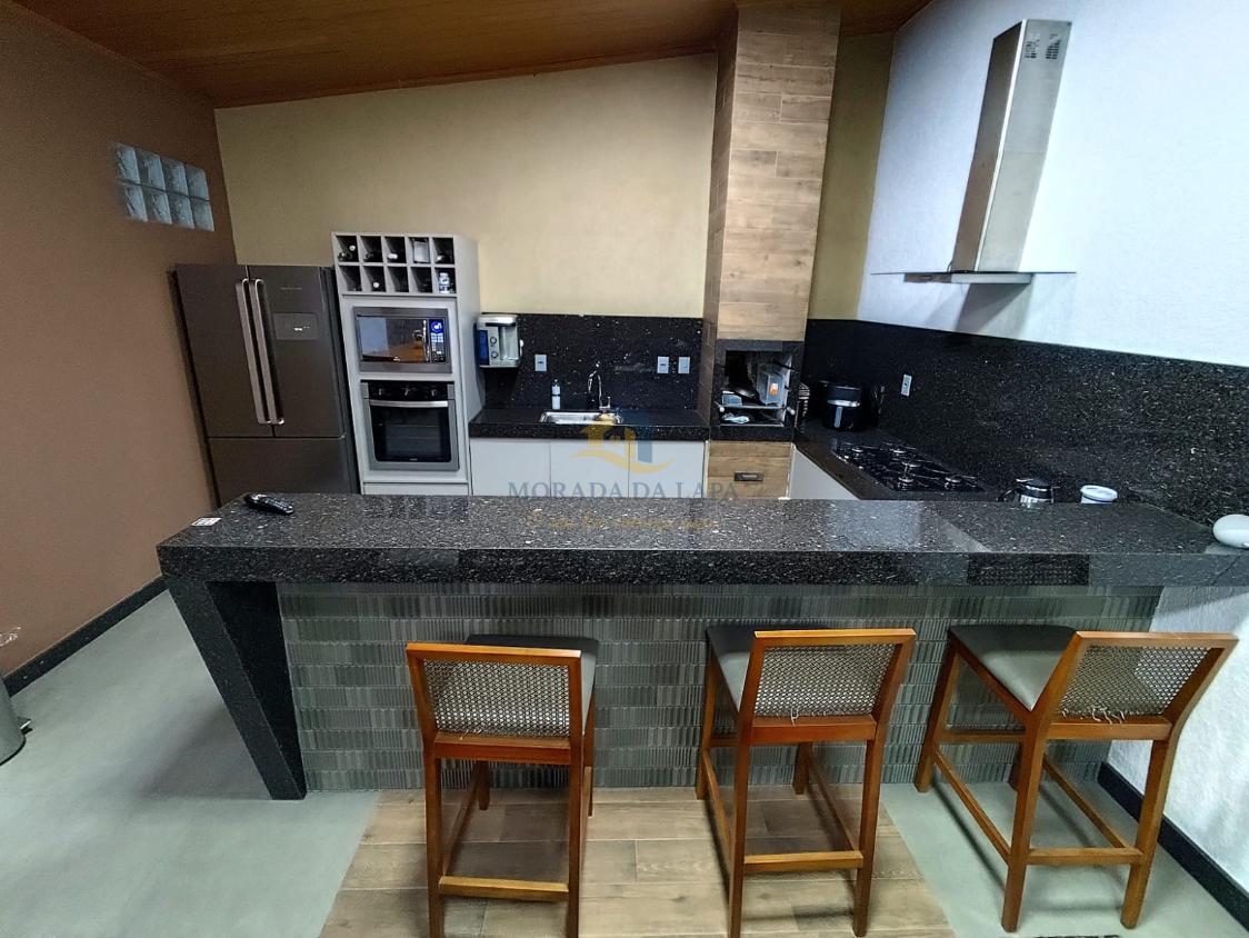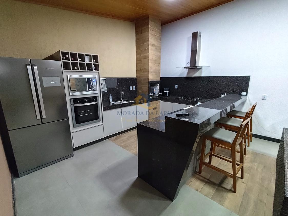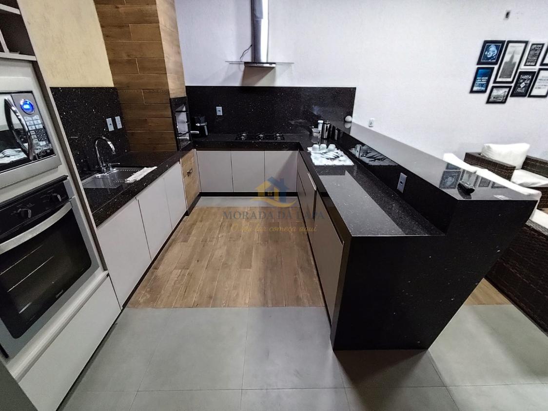 Magnífico espaço gourmet, composto por: cozinha com armários planejados, bancadas e balcão em granito e churrasqueira
