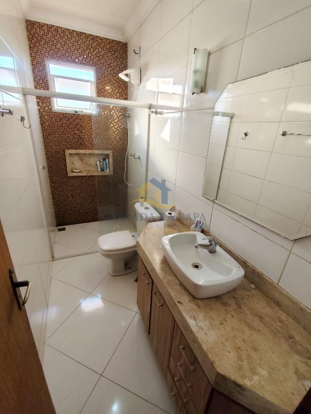 Banho social com box, armário debaixo da pia e pia com bancada em granito