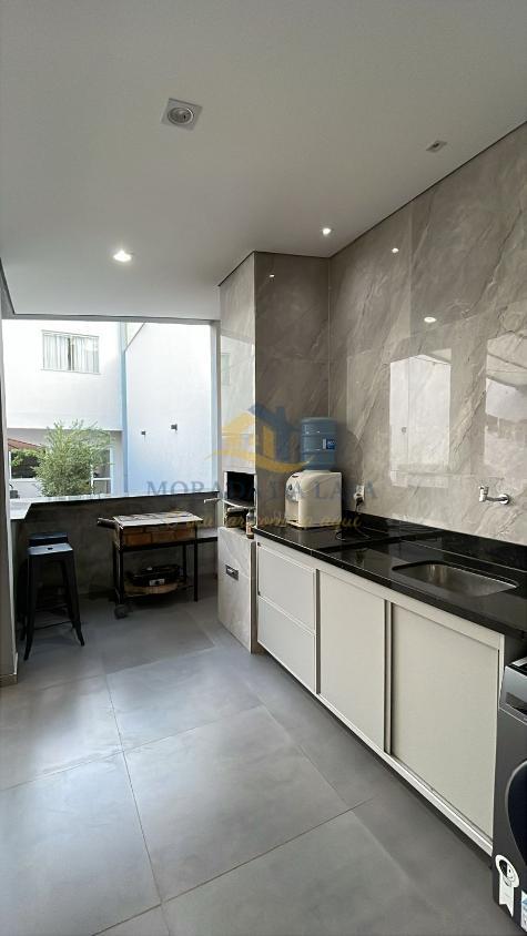 Área gourmet com churrasqueira, pia com bancada em granito, armário planejado e lavabo