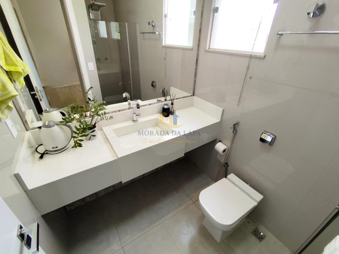 Banho social com box, pia esculpida com bancada em granito e espelho